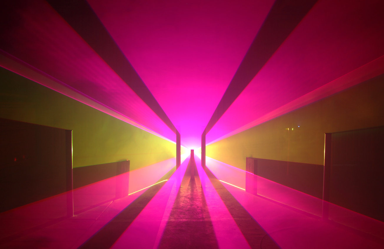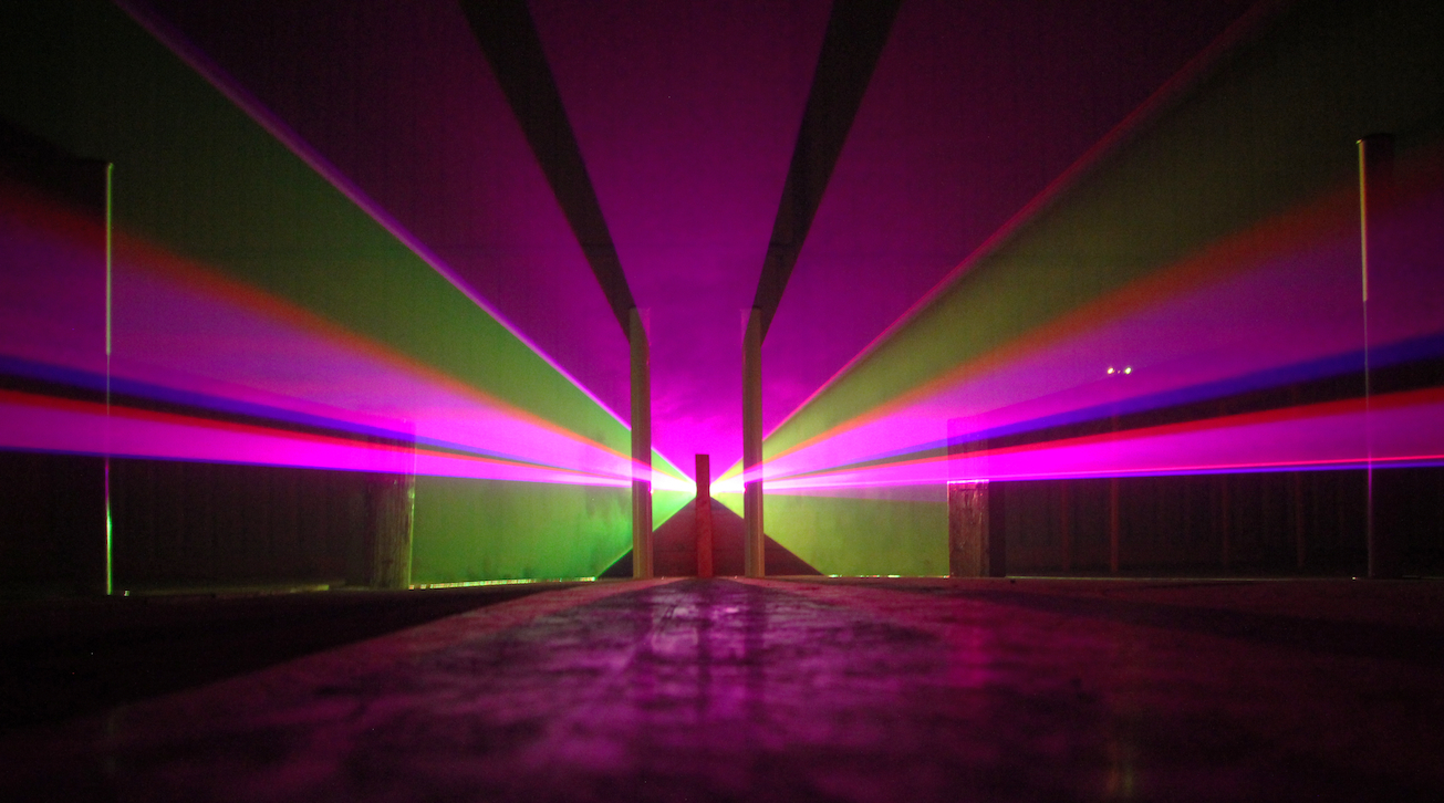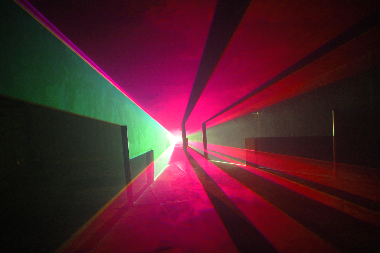 These are a series of static light sculptures that have been created using laser light, smoke, shadows, physical shapes and custom built software to create complex compositions of shadow and light that play with the sense of depth and perception. These pieces challenge the observers idea of perspective and ask them to consider what components of the installation are physical objects and what are non physical objects such as light and shadow. These sculptures fill the room with light and colour creating an almost mesmerizing effect as the beams of precisely mapped light from a laser cut through swarming particles and haze suspended within mid air to create almost solid looking planes of illumination.